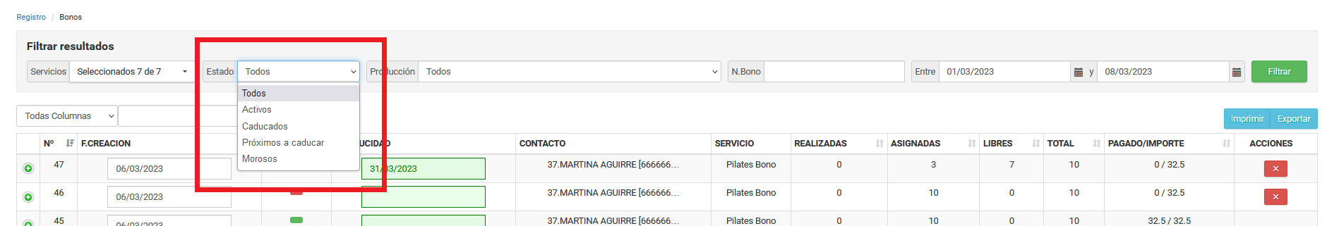Sabremos si un bono esta caducado de forma clara, ya que su fecha de caducidad de mostrará en rojo. Además en esta sección, hemos añadido diferentes filtros de búsqueda para poder acudir y saber rápidamente cuales son los Bonos Activos, Caducados, Próximos a Caducar y Morosos: