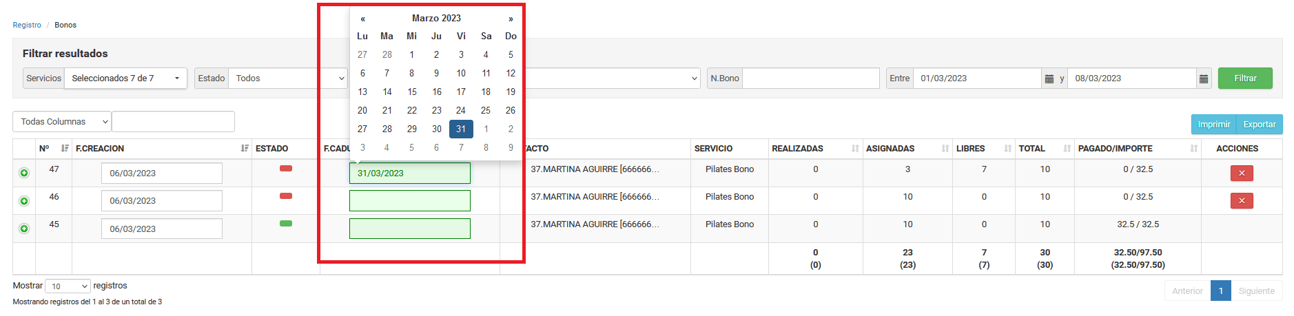 Ahora bien, siempre tenemos la posibilidad de modificar la fecha de Caducidad de los bonos existentes (tengan o no tengan fecha de caducidad anteriormente). Para ello hay que acceder al GESTIÓN > BONOS y pinchar sobre el campo «Fecha de Caducidad«, automáticamente se mostrará un calendario para que escojamos un día y listo:
