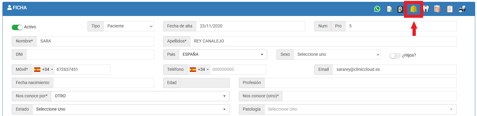 2/ Desde la ficha del paciente si hacemos click en el icono de la campana que encontramos arriba a la derecha: