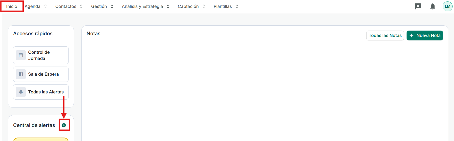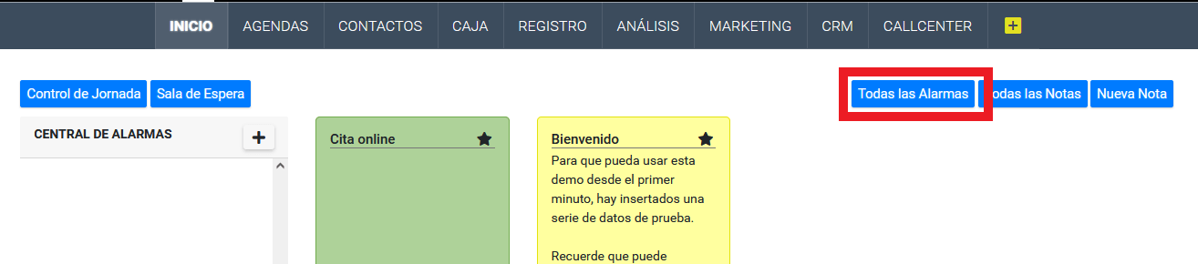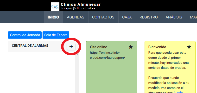 1/ Desde el modulo de inicio haciendo click en el símbolo «+» que aparece en la central de alarmas