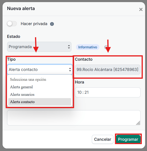 Posteriormente seleccionaremos la opción «alarma de contacto» y buscaremos en «Contacto» al paciente que deseamos avisar, también deberemos de elegir un estado: