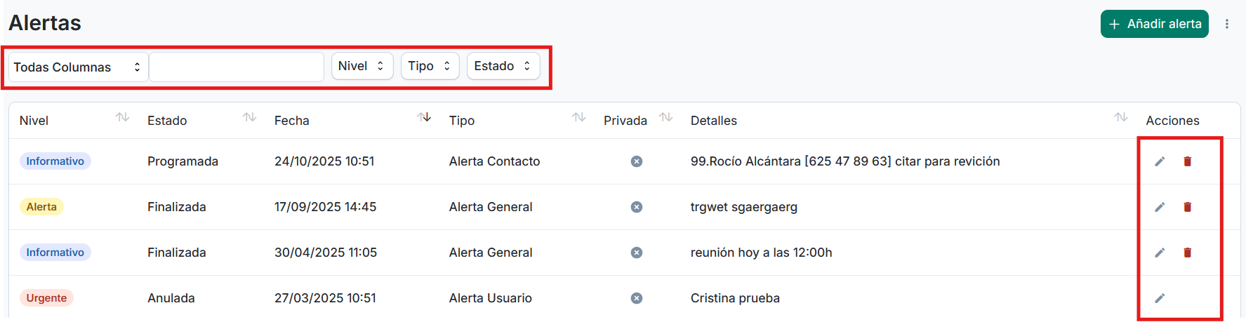 Desde aquí podremos filtrar y editar nuestros avisos: