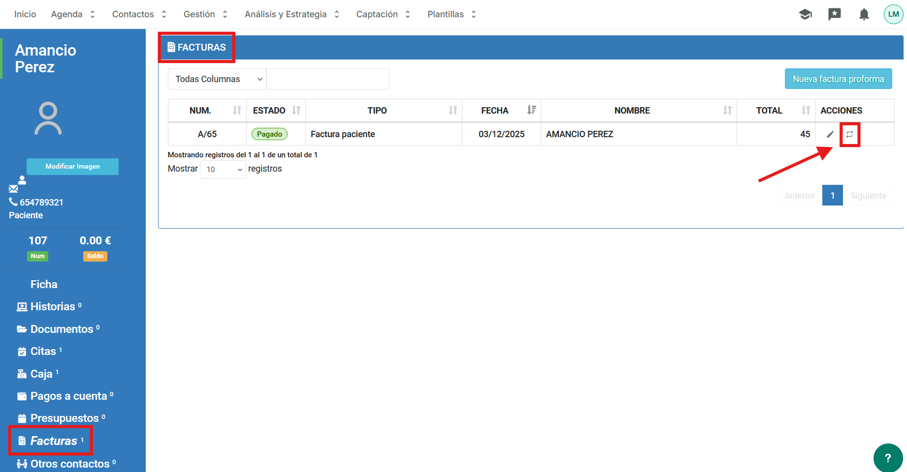 1) Irnos a la sección «Facturas» de la ficha del paciente y devolver la factura que realizamos como servicio (NO de BONO):
