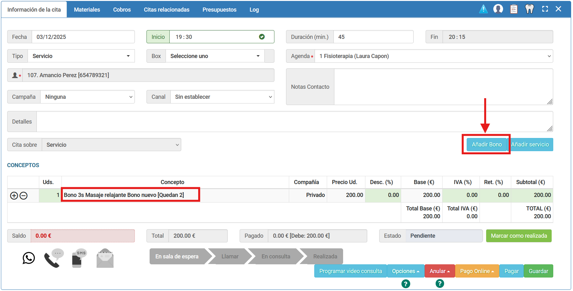 3) Otra opción sería anular la cita creada con el servicio (NO de BONO) y crear una cita nueva con el servicio de BONO.